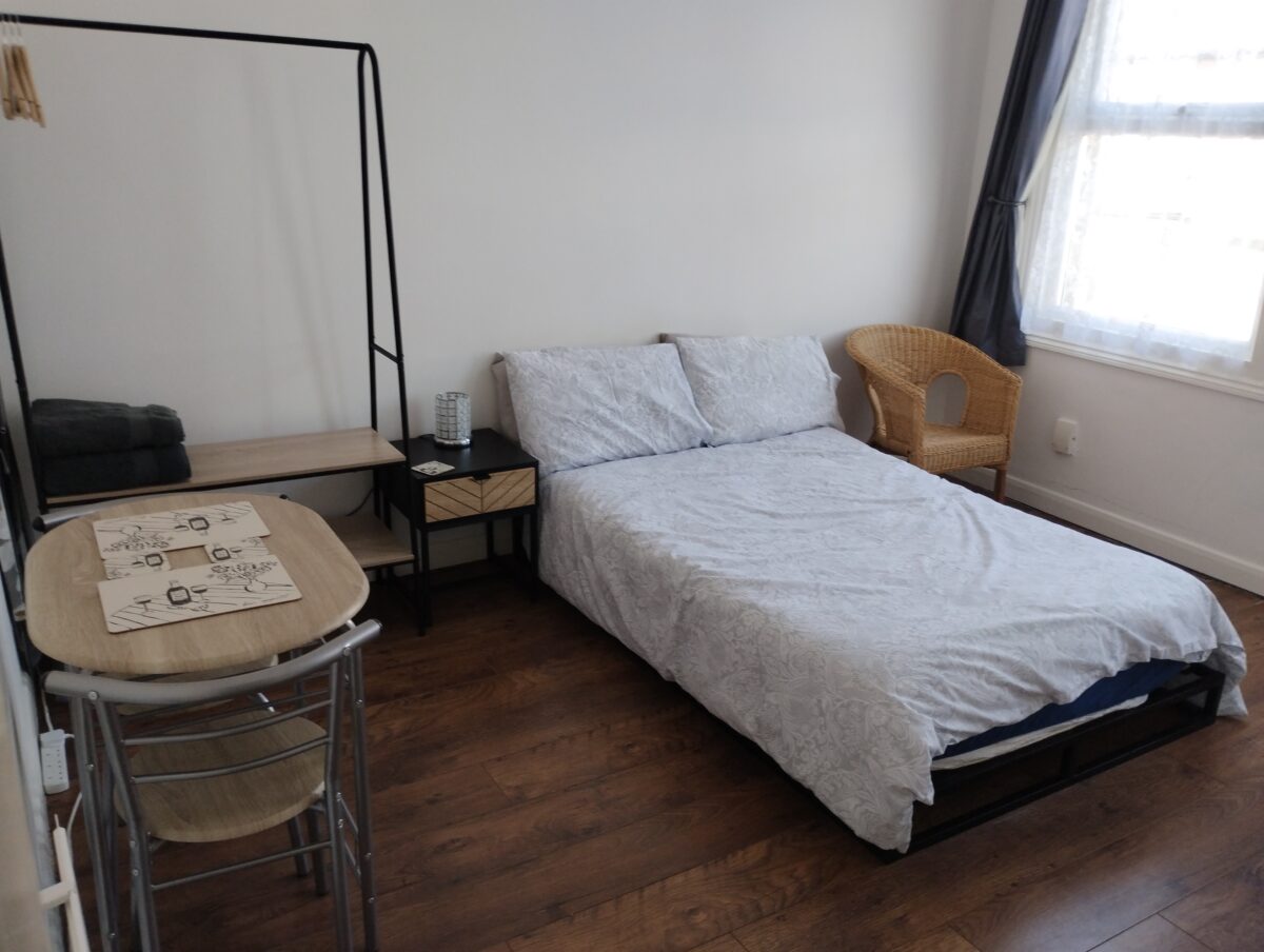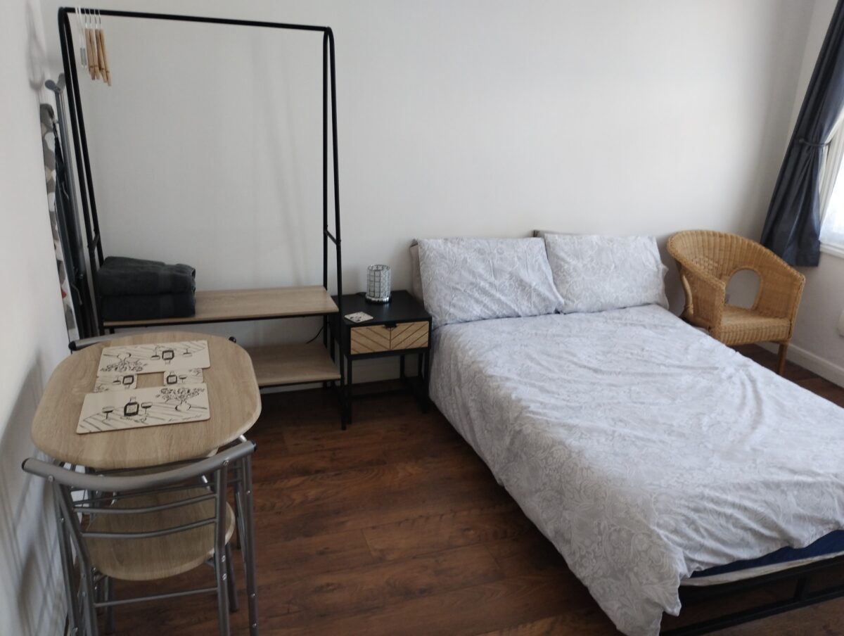 Your own private compact living area with a double bed, kitchenette, comprising double hob, oven-microwave, fridge freezer, sink and work top with extra cupboard space.